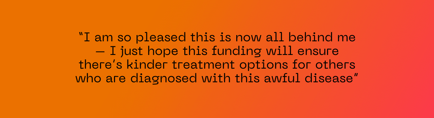 “When I got sepsis, my doctor said he didn’t know how I didn’t have a heart attack. During the first few days, I kept going into shock, my temperature spiking and crashing, and I had uncontrollable shaking. The care they gave was amazing, but my body was completely depleted. I am so pleased this is now all behind me – I just hope this funding will ensure there’s kinder treatment options for others who are diagnosed with this awful disease.”