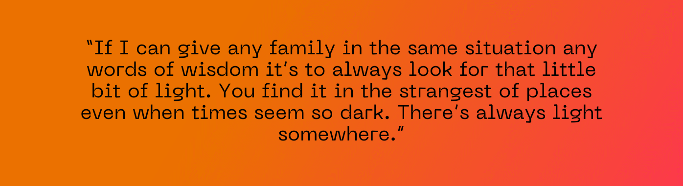 “If I can give any family in the same situation any words of wisdom it’s to always look for that little bit of light. You find it in the strangest of places even when times seem so dark. It can be from the kindness of others, a milestone in treatment or even hearing your little one laugh. There’s always light somewhere. Ours just happened to be in the form of a racehorse.”