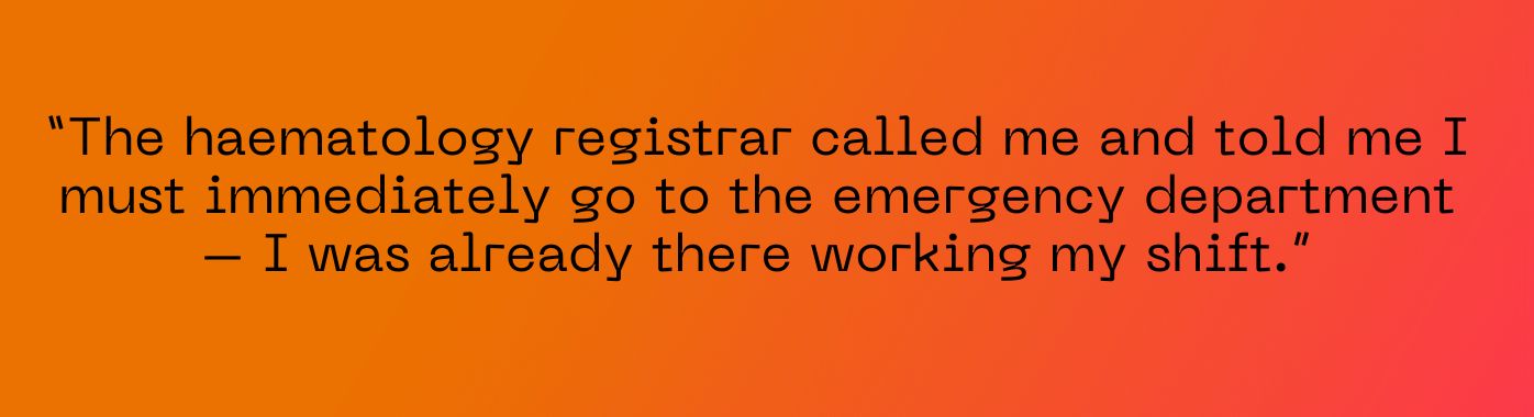“Within hours of my test, the haematology registrar called me and told me I must immediately go to the emergency department – ironically I was already there working my shift. I said to the doctor on the phone “actually I’m already there”. Hayden was on shift with me so we went to the family room. The emergency haematological registrar came down to meet us and told us it looked like I had leukaemia and needed to be admitted. Within the space of an hour I went from being in the doctors’ area to being a patient in a bed.”