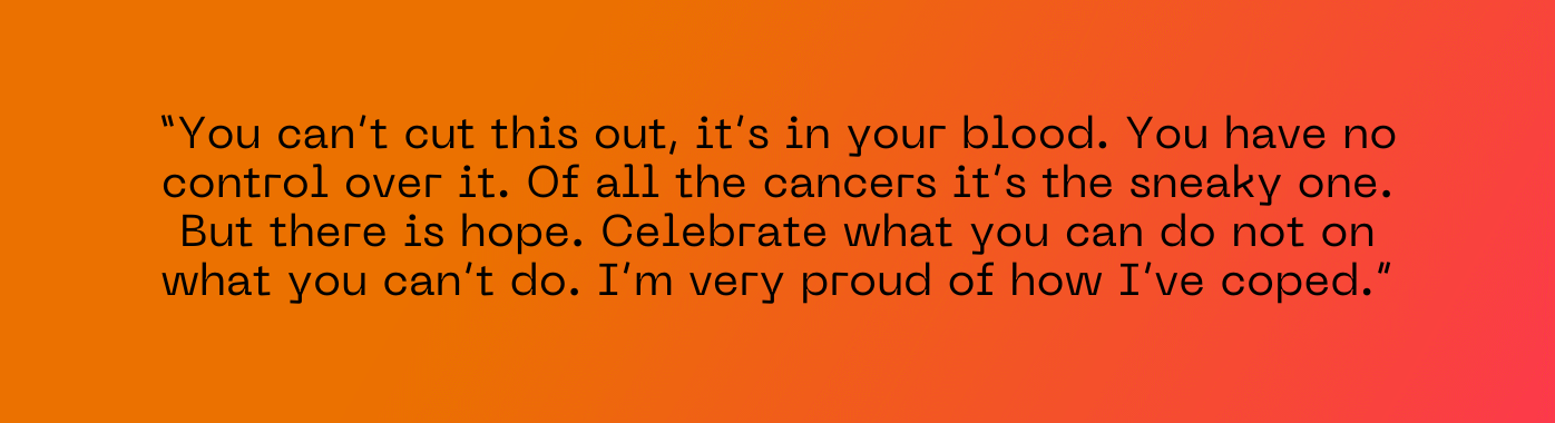 “You can’t cut this out, it’s in your blood. You have no control over it. Of all the cancers it’s the sneaky one. But there is hope. Celebrate what you can do not focus on what you can’t do. I’m very proud of how I’ve coped.