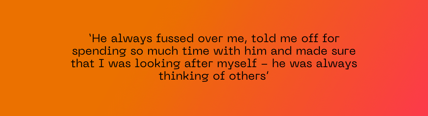 “The nurse said that his breathing had got worse and the ward couldn’t give him specialist care so they transferred him there so he could have closer monitoring and better access to oxygen. This had all happened in the middle of the night and my dad had asked the staff not to call his family until the next morning as he did not want to worry us. Somehow this wasn’t communicated to us in the morning. I was exhausted from crying with worry so I was sent home from work.