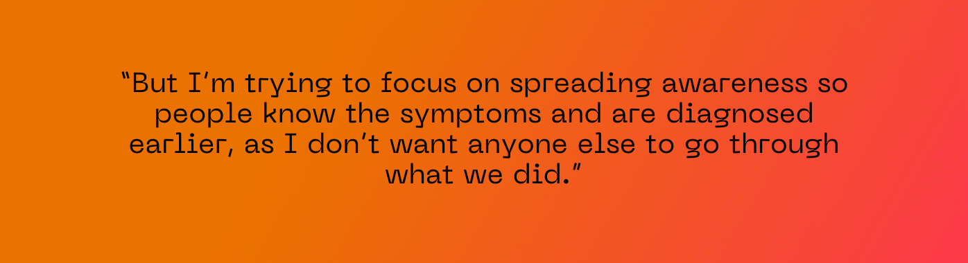 “I took two weeks off work initially then went back as a distraction really. I feel like I’m slowly getting there. The trauma took a toll on my physical health as well as mentally, and I get ill a lot still. Some days are alright some days aren’t. But I’m trying to focus on spreading awareness so people know the symptoms and are diagnosed earlier, as I don’t want anyone else to go through what we did.”