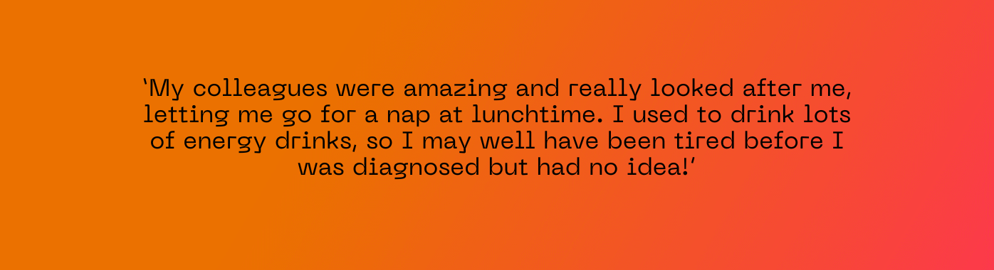 “The chemo tablet made me feel weak and tired but not for long. My colleagues were amazing and really looked after me, letting me go for a nap at lunchtime. I used to drink lots of energy drinks, so I may well have been tired before I was diagnosed but had no idea! I take better care of myself now and try and stay healthy.”