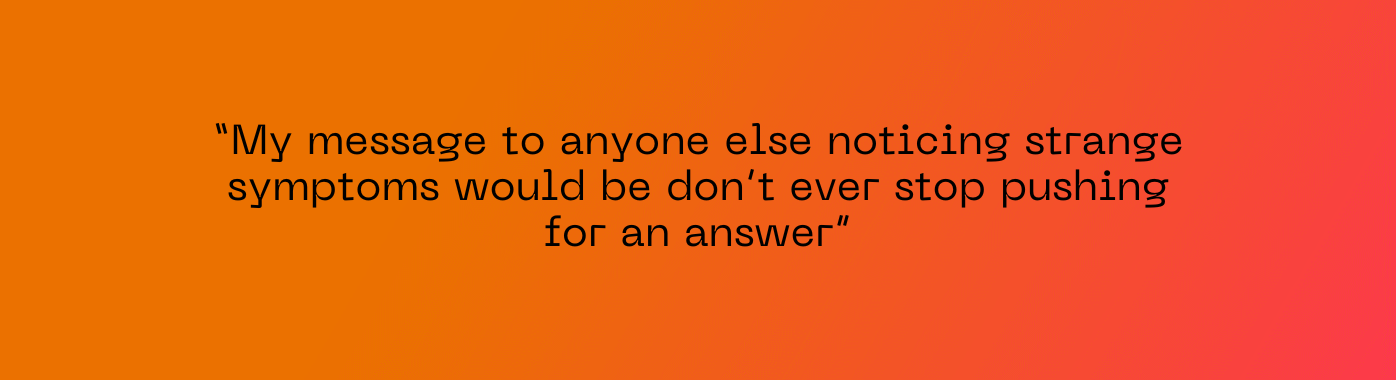 “My message to anyone else noticing strange symptoms would be don’t ever stop pushing for an answer. No one knows their body better than you. If you think something is wrong, keep making those appointments and even ask for a second opinion. I knew something wasn’t right, I could feel it. Although my blood tests came back normal each time, I still knew something underlying was going on. Don’t take no for an answer and never ignore changes in your body.”