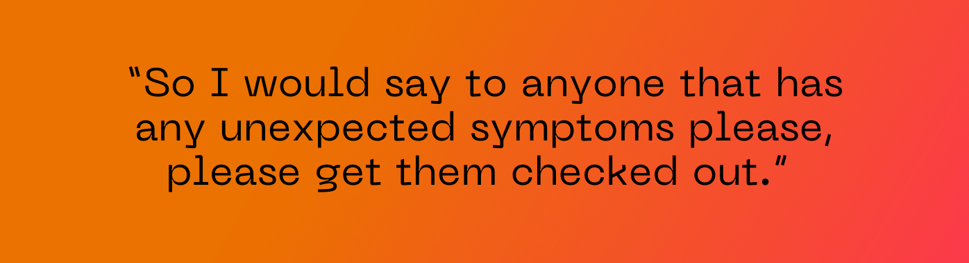 “I have been so lucky, and it’s because I went to the doctor when my boss told me to and the GP acted quickly. So I would say to anyone that has any unexpected symptoms please, please get them checked out.”