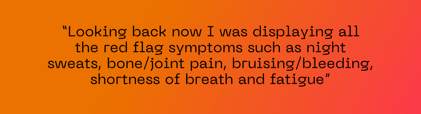 “Looking back now I was displaying all the red flag symptoms such as night sweats, bone/joint pain, bruising/bleeding, shortness of breath and fatigue,” said Emma. “I remember running a 10K about a month before and having to stop quite a lot. I never had to stop before. I was wondering why do I need to stop?